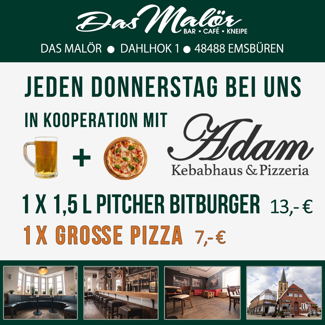 Jeden Donnerstag gibt´s in Kooperation mit „Das Malör“ 1x 1,5 Liter Pitcher und eine große Pizza für unschlagbare 20€!